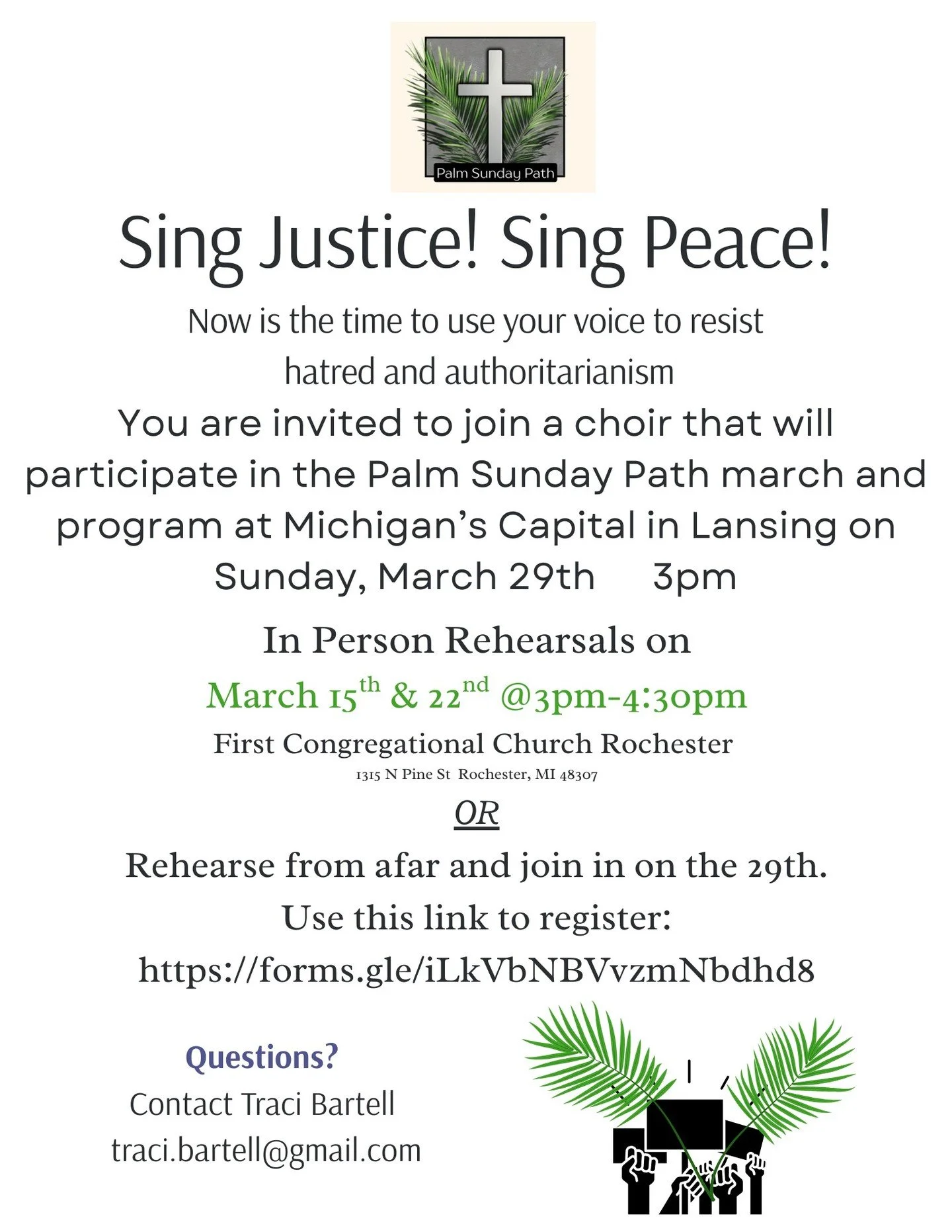 Now is the time to use your voice to resist hatred and authoritarianism. You are invited to join a choir that will participate in the Palm Sunday Path Michigan procession and gathering at the state capitol. Music will be sent to choir participants ahead of on-site rehearsals and Palm Sunday.